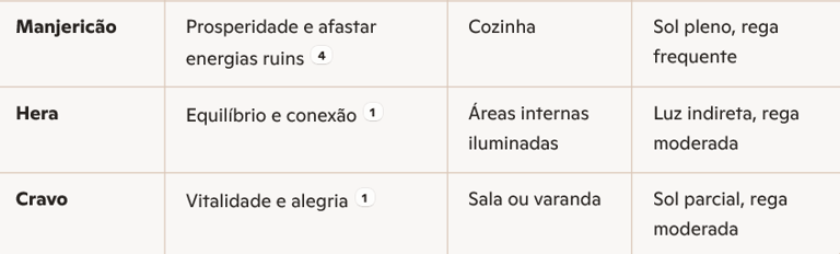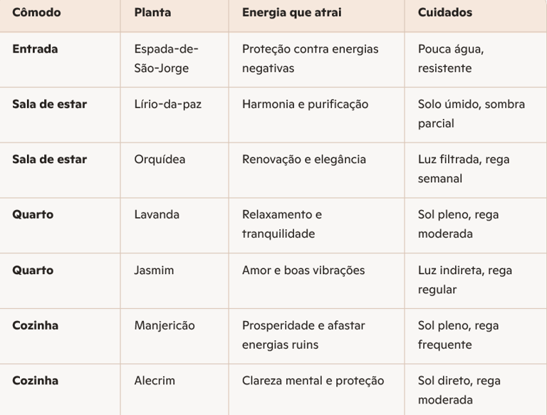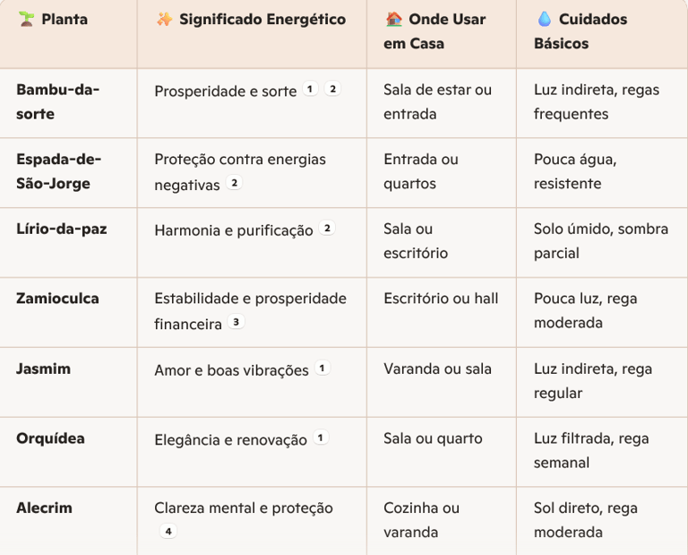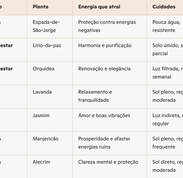 Aqui está uma tabela prática com plantas que você pode ter em casa para atrair boas energias, prosperidade e equilíbrio.