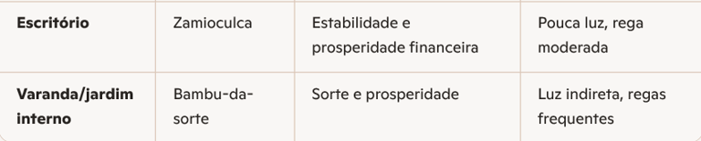 • Escritório: plantas resistentes que simbolizam crescimento e estabilidade.